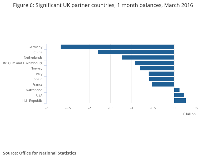 Between Quarter 4 (October to December) 2015 and Quarter 1 (January to March) 2016, the UK’s trade in goods deficit with the EU widened by £0.7 billion to £23.9 billion – the widest on record - reflecting a 1.6% increase in exports and a 2.3% increase in imports.