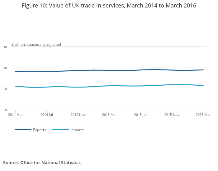 Between February 2016 and March 2016, the estimated surplus on trade in services increased by £0.3 billion to £7.4 billion. Exports were estimated to have been £18.9 billion and imports £11.6 billion.