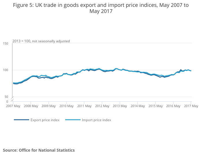 Figure 5: UK trade in goods export and import price indices, May 2007 to May 2017