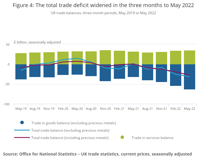 The total trade in goods and services deficit, excluding precious metals, widened by £8.6 billion to £27.9 billion in the three months to May 2022 compared with the three months to February 2022.