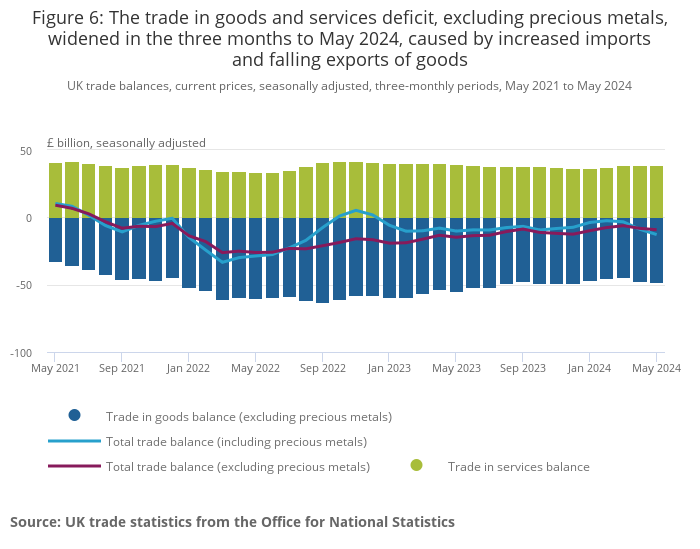 The trade in goods deficit in value terms, excluding precious metals, widened by £3.3 billion to £48.2 billion in the three months to May 2024, as goods exports decreased while imports increased. The trade in services surplus is estimated to have widened by £1.7 billion to £39.0 billion, driven by an increase in exports of services.