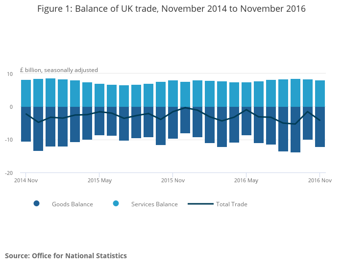 - The deficit on trade in goods and services widens to £4.2 billion in November 2016