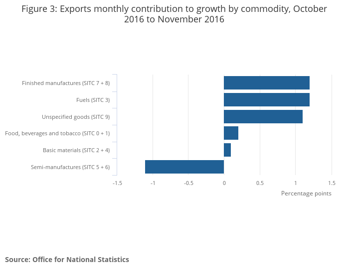 Exports increased by £3.4 billion (4.6%) to £77.9 billion in the 3 months to November 2016, compared with £74.5 billion in the 3 months to August 2016. Figure 5 shows the contribution of each commodity group to growth in exports of goods, using the Standard International Trade Classification (SITC Rev 4) in the 3 months to November 2016 compared with the 3 months to August 2016.