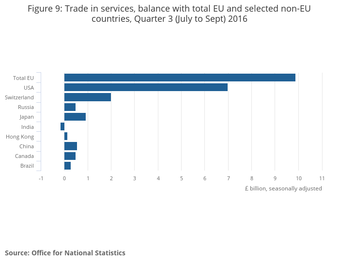 In Quarter 3 2016, the largest trade in services surplus was with the USA (£7.0 billion), this was lower than the surplus with EU countries of £9.9 billion.