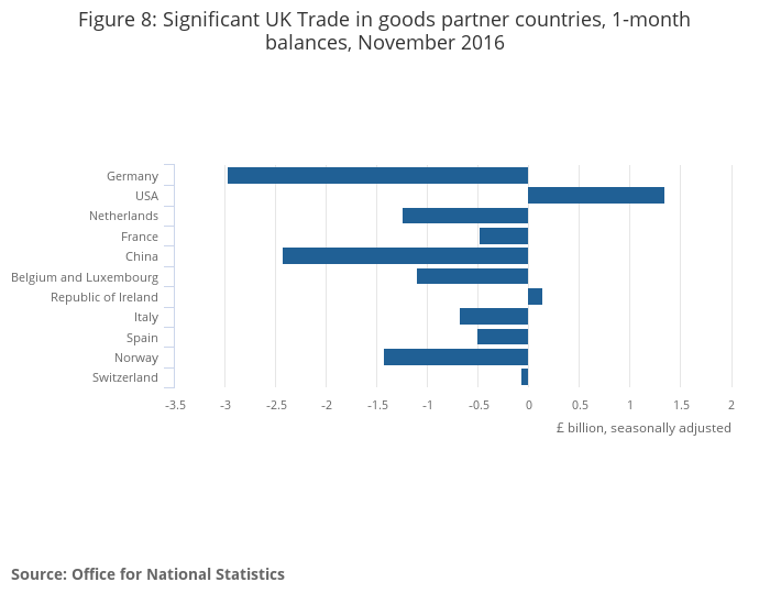 Germany was the UK’s top import partner with imports of £6.0 billion in November 2016, an increase of £0.5 billion when compared with October 2016. This was due to an increase in exports of road vehicles and aircraft.