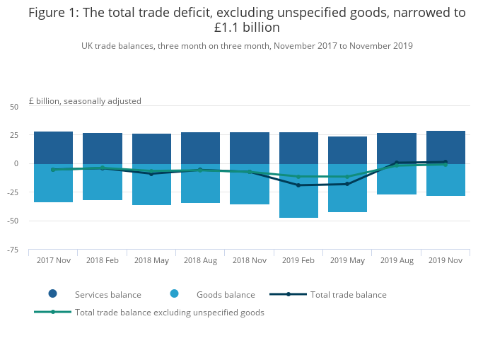 Excluding unspecified goods (which includes non-monetary gold), the trade in goods deficit widened £0.7 billion to £29.9 billion in the three months to November 2019, as imports grew faster than exports; the trade in services surplus widened £1.7 billion to £28.8 billion.