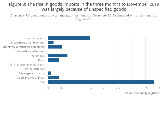 Goods imports increased £4.1 billion to £110.2 billion in the three months to November 2019; goods exports increased by a lesser £2.6 billion to £85.1 billion. The rise in goods imports was largely because of increases in unspecified goods (which includes non-monetary gold), chemicals, and machinery and transport equipment of £1.5 billion, £0.9 billion and £0.7 billion respectively. The rise in goods exports was mainly because of increases in unspecified goods, machinery and transport equipment, and miscellaneous manufactures of £0.9 billion, £0.6 billion and £0.5 billion respectively.