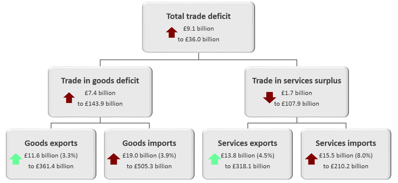| Total trade | Increased £25.4 billion (3.9%) to £679.5 billion | Increased £34.5 billion (5.1%) to £715.5 billion | Widened £9.1 billion to £36.0 billion (deficit) |