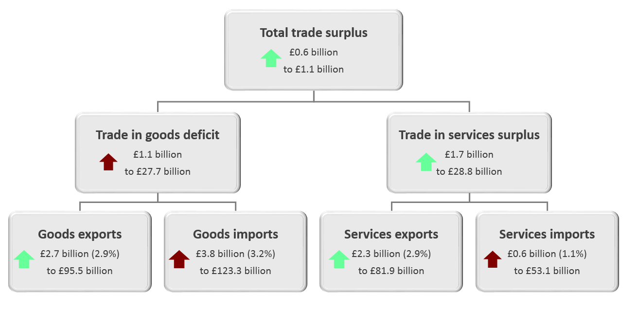 | Total trade | Increased £5.1 billion (2.9%) to £177.5 billion | Increased £4.4 billion (2.6%) to £176.4 billion | Increased £0.6 billion to £1.1 billion (surplus) |