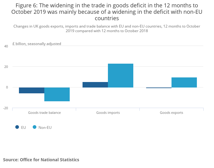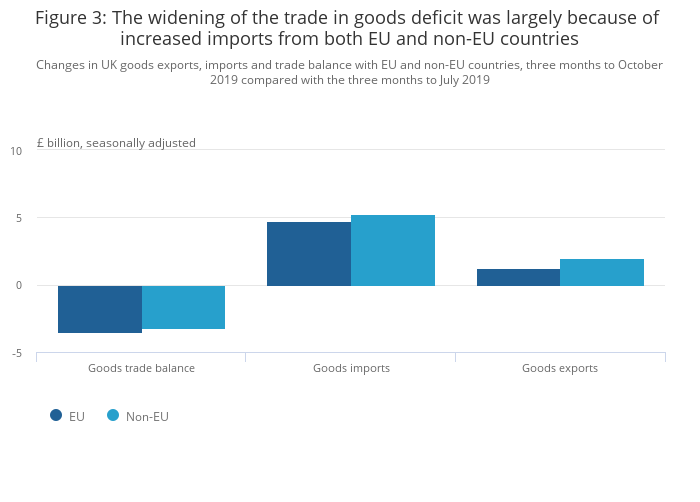 The trade in goods deficit with EU countries widened £3.5 billion to £25.0 billion in the three months to October 2019, while with non-EU countries it widened by £3.3 billion to £10.6 billion.