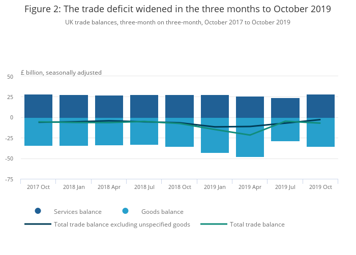 - Total trade deficit widened £2.3 billion in the three months to October 2019