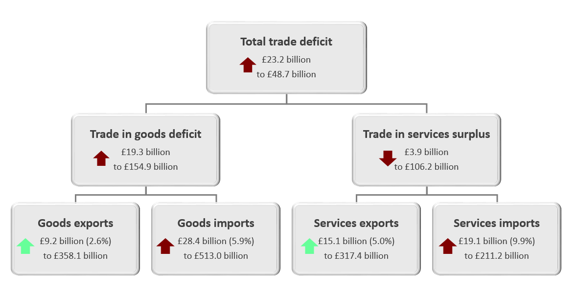 Total trade | Increased £24.3 billion (3.7%) to £675.5 billion | Increased £47.5 billion (7.0%) to £724.2 billion | Widened £23.2 billion to £48.7 billion (deficit) |