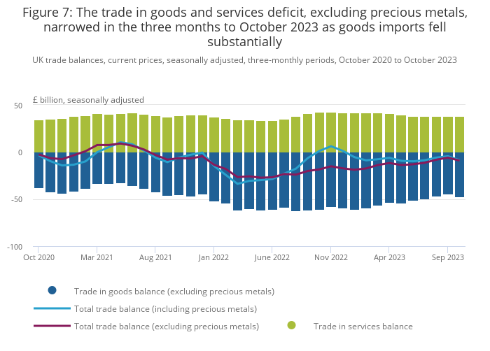 - The trade in goods deficit narrowed by £2.1 billion to £47.3 billion in the three months to October 2023, while the trade in services surplus widened by £0.2 billion to £38.1 billion.