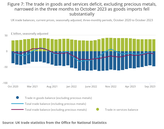 The trade in goods deficit in value terms, excluding precious metals, narrowed by £2.1 billion to £47.3 billion in the three months to October 2023. The trade in services surplus widened by £0.2 billion to £38.1 billion.