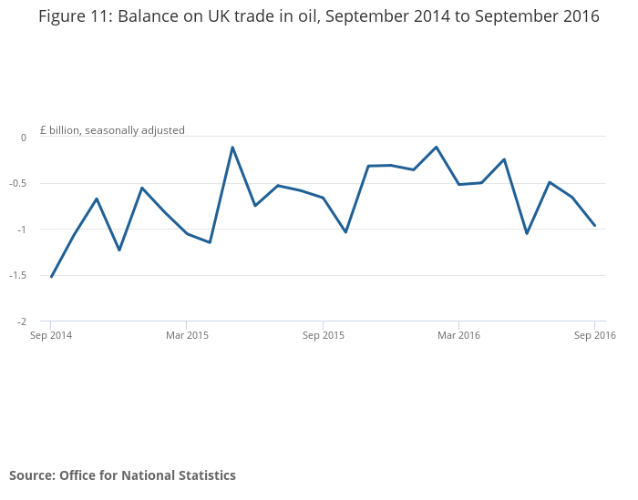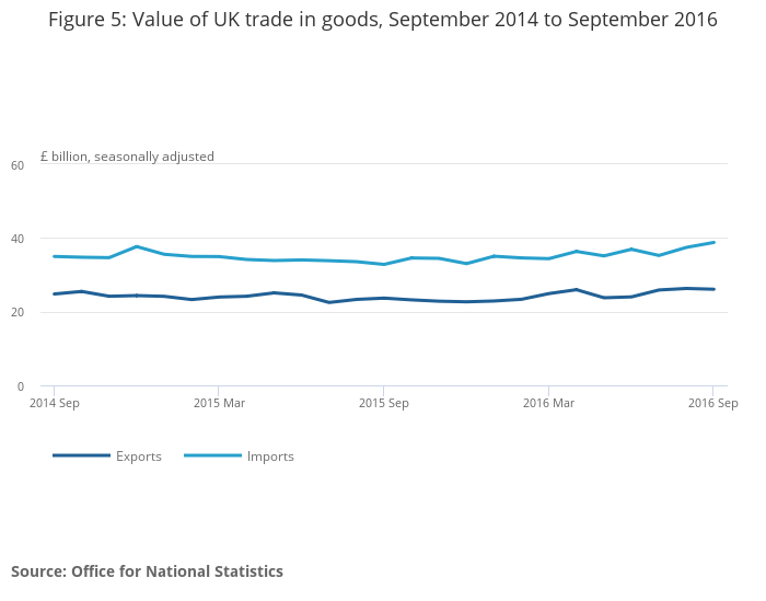 The deficit on trade in goods was £12.7 billion in September 2016, widening by £1.6 billion from August 2016. This widening reflected a decrease in exports of £0.2 billion to £26.1 billion and an increase in imports of £1.3 billion to a record £38.8 billion. There were increases in imports of ships, material manufactures, road vehicles and oil.