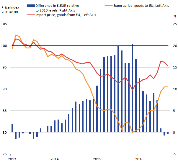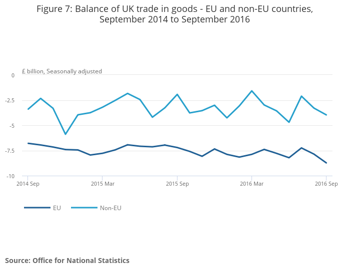 Between Quarter 2 2016 and Quarter 3 2016, the UK’s trade in goods deficit with the EU widened by £0.4 billion to £23.8 billion as imports increased more than export. Between Quarter 2 2016 and Quarter 3 2016, the UK’s trade in goods deficit with countries outside the EU narrowed by £1.9 billion to £9.4 billion, attributed to an increase in exports (5.9%).