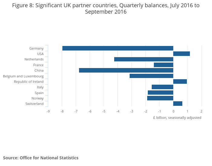 Between Quarter 2 2016 and Quarter 3 2016, the UK’s trade in goods deficit with the EU widened by £0.4 billion to £23.8 billion as imports increased more than export. Between Quarter 2 2016 and Quarter 3 2016, the UK’s trade in goods deficit with countries outside the EU narrowed by £1.9 billion to £9.4 billion, attributed to an increase in exports (5.9%).