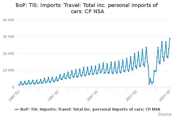 Download this time seriesBoP: TiS: Imports: Travel: Total inc. personal imports of cars: CP NSA