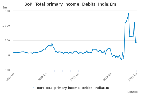 Download this time seriesBoP: Total primary income: Debits: India:£m