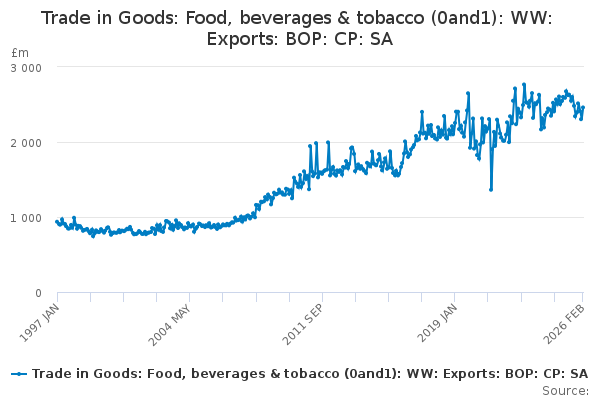 Download this time seriesTrade in Goods: Food, beverages & tobacco (0and1): WW: Exports: BOP: CP: SA