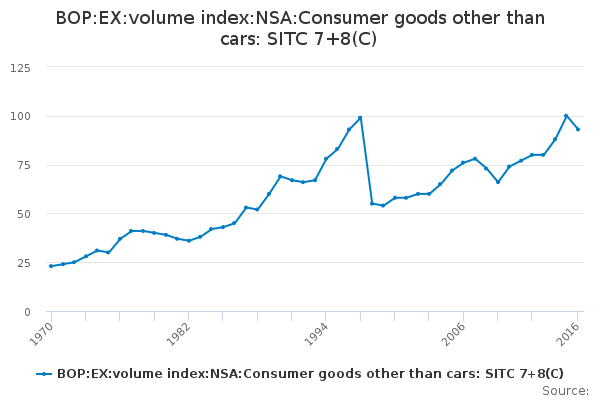 Download this time seriesBOP:EX:volume index:NSA:Consumer goods other than cars: SITC 7+8(C)