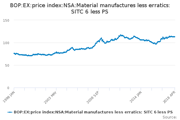 Download this time seriesBOP:EX:price index:NSA:Material manufactures less erratics: SITC 6 less PS