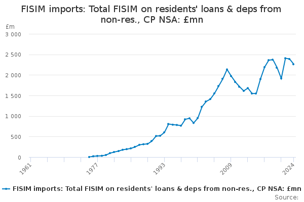 Download this time seriesFISIM imports: Total FISIM on residents' loans & deps from non-res., CP NSA: £mn