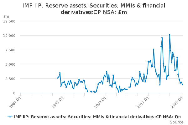 Download this time seriesIMF IIP: Reserve assets: Securities: MMIs & financial derivatives:CP NSA: £m