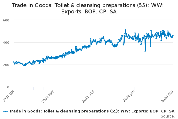 Download this time seriesTrade in Goods: Toilet & cleansing preparations (55): WW: Exports: BOP: CP: SA