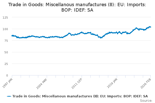 Download this time seriesTrade in Goods: Miscellanous manufactures (8): EU: Imports: BOP: IDEF: SA