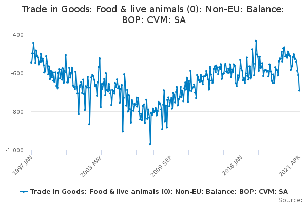 Download this time seriesTrade in Goods: Food & live animals (0): Non-EU: Balance: BOP: CVM: SA