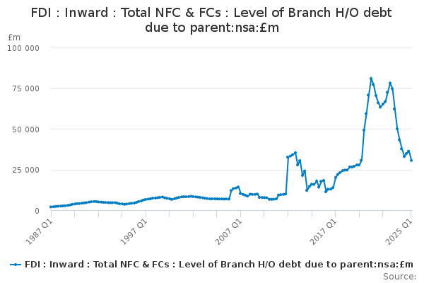 Download this time seriesFDI : Inward : Total NFC & FCs : Level of Branch H/O debt due to parent:nsa:£m