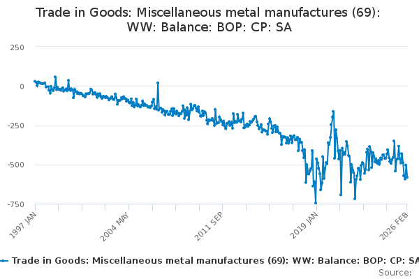 Download this time seriesTrade in Goods: Miscellaneous metal manufactures (69): WW: Balance: BOP: CP: SA