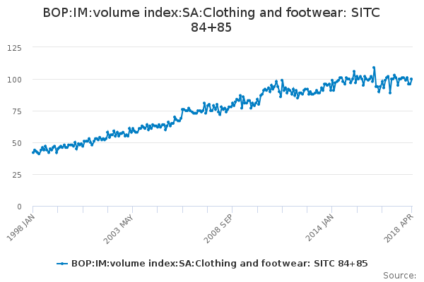 Download this time seriesBOP:IM:volume index:SA:Clothing and footwear: SITC 84+85