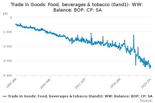 Download this time seriesTrade in Goods: Food, beverages & tobacco (0and1): WW: Balance: BOP: CP: SA