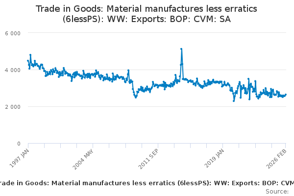 Download this time seriesTrade in Goods: Material manufactures less erratics (6lessPS): WW: Exports: BOP: CVM: SA
