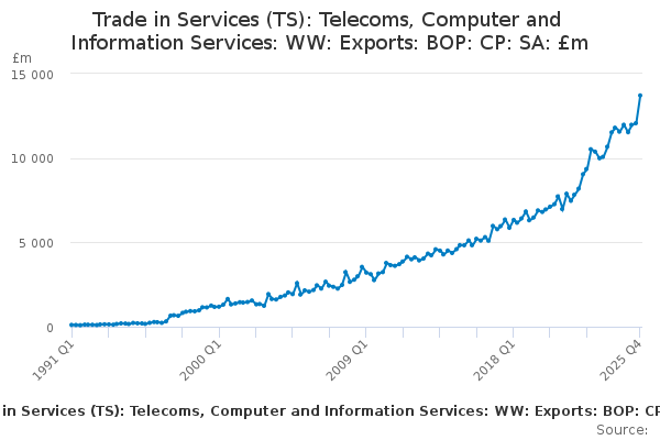 Download this time seriesTrade in Services (TS): Telecoms, Computer and Information Services: WW: Exports: BOP: CP: SA: £m