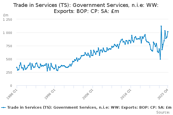 Download this time seriesTrade in Services (TS): Government Services, n.i.e: WW: Exports: BOP: CP: SA: £m
