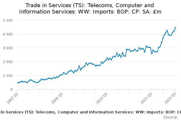 Download this time seriesTrade in Services (TS): Telecoms, Computer and Information Services: WW: Imports: BOP: CP: SA: £m