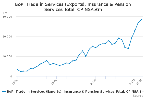 Download this time seriesBoP: Trade in Services (Exports): Insurance & Pension Services Total: CP NSA:£m