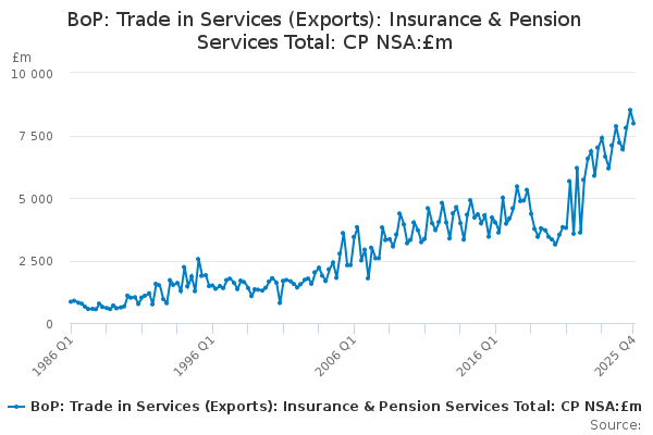 Download this time seriesBoP: Trade in Services (Exports): Insurance & Pension Services Total: CP NSA:£m
