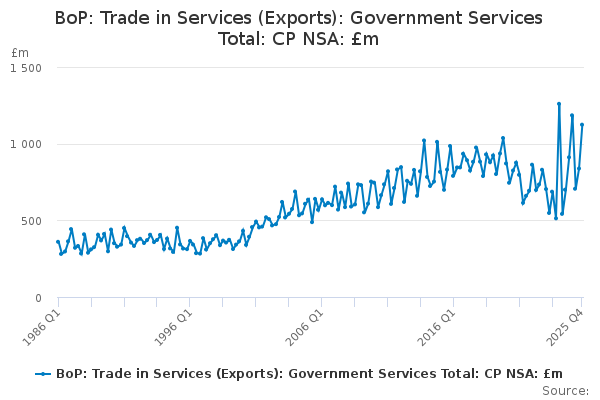 Download this time seriesBoP: Trade in Services (Exports): Government Services Total: CP NSA: £m