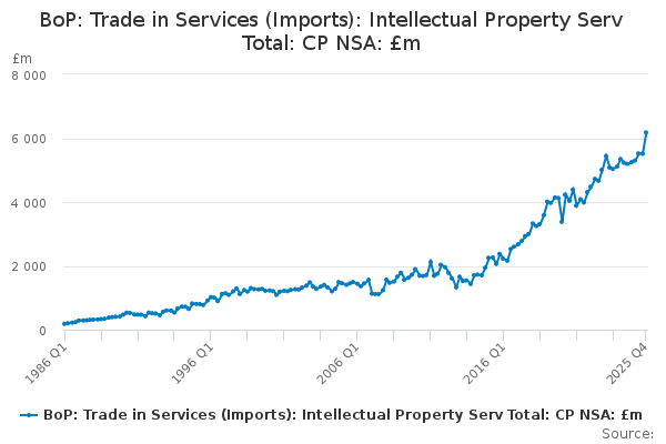 Download this time seriesBoP: Trade in Services (Imports): Intellectual Property Serv Total: CP NSA: £m