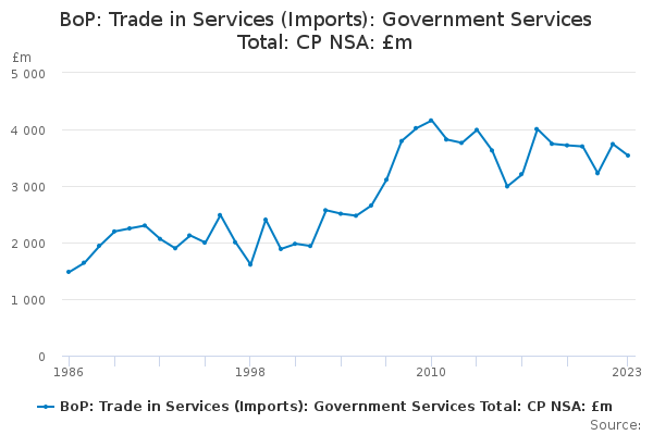 Download this time seriesBoP: Trade in Services (Imports): Government Services Total: CP NSA: £m
