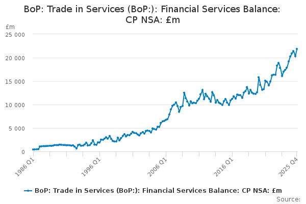 Download this time seriesBoP: Trade in Services (BoP:): Financial Services Balance: CP NSA: £m