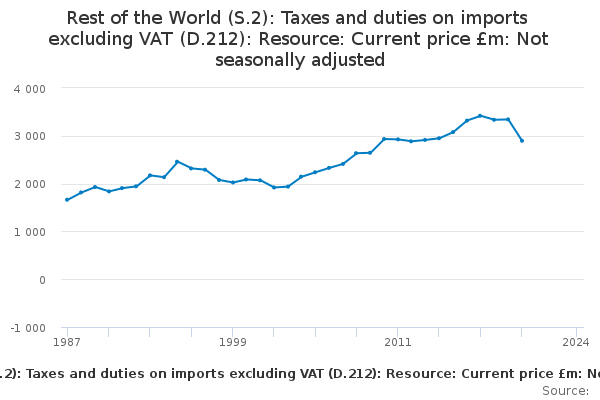 Download this time seriesRest of the World (S.2): Taxes and duties on imports excluding VAT (D.212): Resource: Current price £m: Not seasonally adjusted