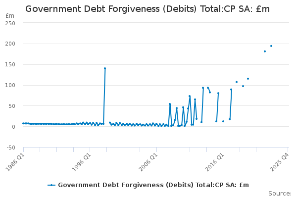 Download this time seriesGovernment Debt Forgiveness (Debits) Total:CP SA: £m