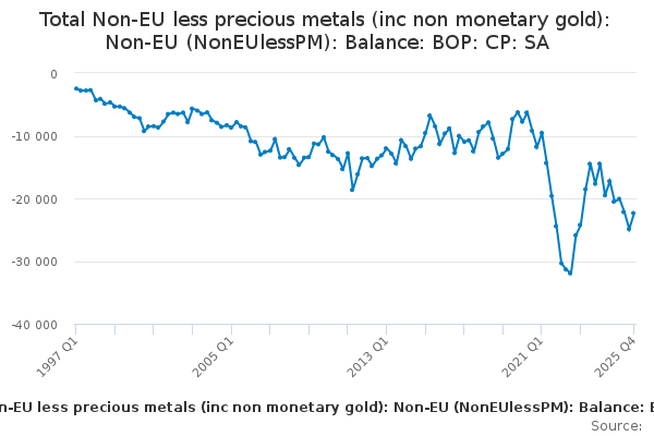 Download this time seriesTotal Non-EU less precious metals (inc non monetary gold): Non-EU (NonEUlessPM): Balance: BOP: CP: SA