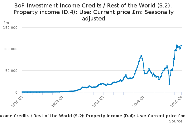 Download this time seriesBoP Investment Income Credits / Rest of the World (S.2): Property income (D.4): Use: Current price £m: Seasonally adjusted