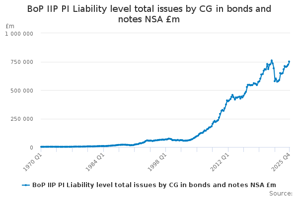 Download this time seriesBoP IIP PI Liability level total issues by CG in bonds and notes NSA £m